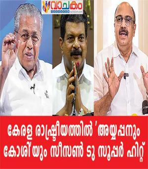 കേരളാരാഷ്ട്രീയത്തിൽ ഇപ്പോൾ 'അയ്യപ്പനും കോശിയും' എന്ന സച്ചി സിനിമയുടെ സീസൺ ടൂ അരങ്ങേറുകയാണ്. കുമ്മാട്ടിക്കളിയിൽ ചിലരെ 'ഊടു പാട് പിടിച്ച്' ഞെരുച്ചുകൊല്ലുന്ന ബിജു മേനോന്റെ അയ്യപ്പനെന്ന കഥാപാത്രവും, പഴയ തമ്പ്രാന്റെ തൊപ്പി തലയിലുള്ള പൃഥ്വിരാജിന്റെ കോശി എന്ന കഥാപാത്രവും തമ്മിലുള്ള ഉരസലും ചൊറിയലുമാണ് അയ്യപ്പനും കോശി എന്ന സിനിമയുടെ ഹൈലൈറ്റ്. ഇപ്പോൾ കേരളാരാഷ്ട്രീയത്തിൽ അയ്യപ്പൻ പൊലീസ് ആരാണെന്നും, മരിക്കാൻ എനിക്ക് ഭയമില്ലെന്നു പറഞ്ഞു കൊണ്ടിരിക്കുന്ന 'കോശി തമ്പ്രാ' ആരാണെന്നും ജനത്തിനു മനസ്സിലായിട്ടുണ്ട്.