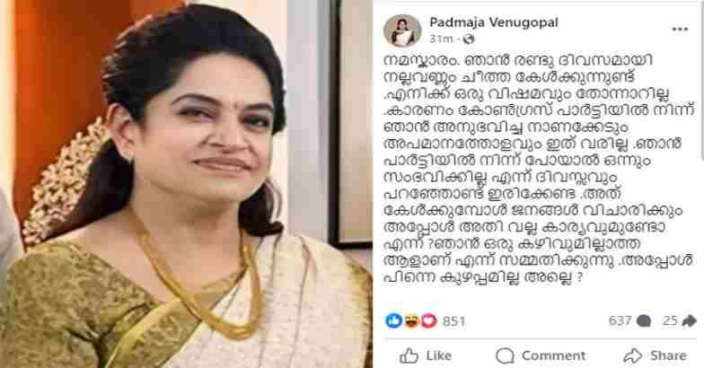 കോണ്ഗ്രസില് അനുഭവിച്ച നാണക്കേടും അപമാനവും ഇപ്പോഴത്തെ ചീത്ത വിളികളേക്കാള് കഠിനമായിരുന്നുവെന്ന് പറയുന്ന പദ്മജ താന് പാര്ട്ടിയില് നിന്ന് പോയാല് ഒന്നും സംഭവിക്കില്ല എന്ന് പറഞ്ഞോണ്ടിരിക്കേണ്ടെന്നും ആവശ്യപ്പെടുന്നുണ്ട്. താന് ഒരു കഴിവുമില്ലാത്ത ആളാണെന്ന് സമ്മതിക്കുന്നുവെന്നും അപ്പോള് പിന്നെ ഒരു കുഴപ്പവുമില്ലല്ലോ എന്നും സൂചിപ്പിച്ചാണ് കുറിപ്പ് അവസാനിപ്പിക്കുന്നത്.